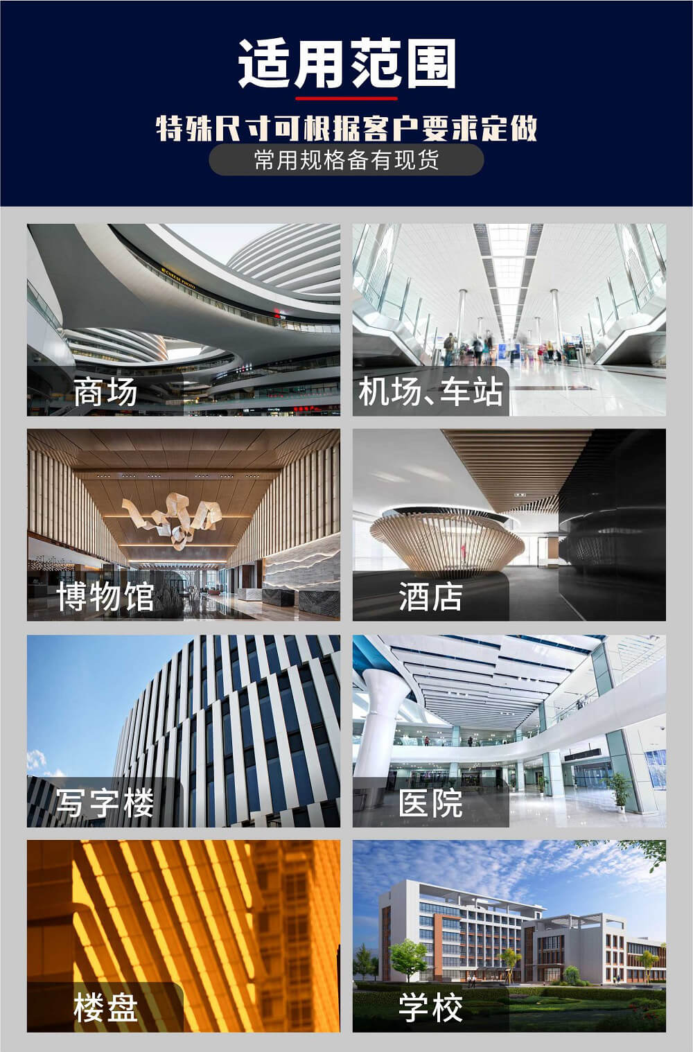 | 適用范圍 | 機(jī)場、地鐵站、商場、娛樂場所、辦公室、展廳、天花吊頂裝飾等 | ||